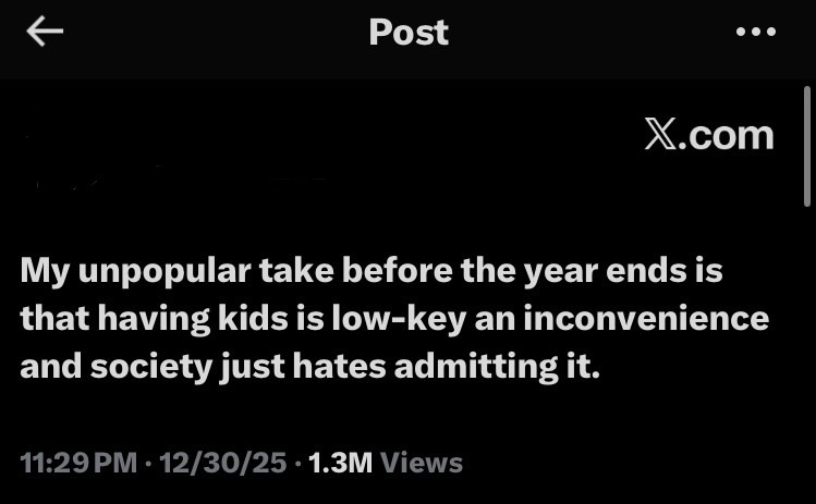 That’s not bold or unpopular. It’s just the kind of edgy-sounding quip people toss out on X when they want likes from others who also don’t have kids yet, or who regret theirs and need validation.